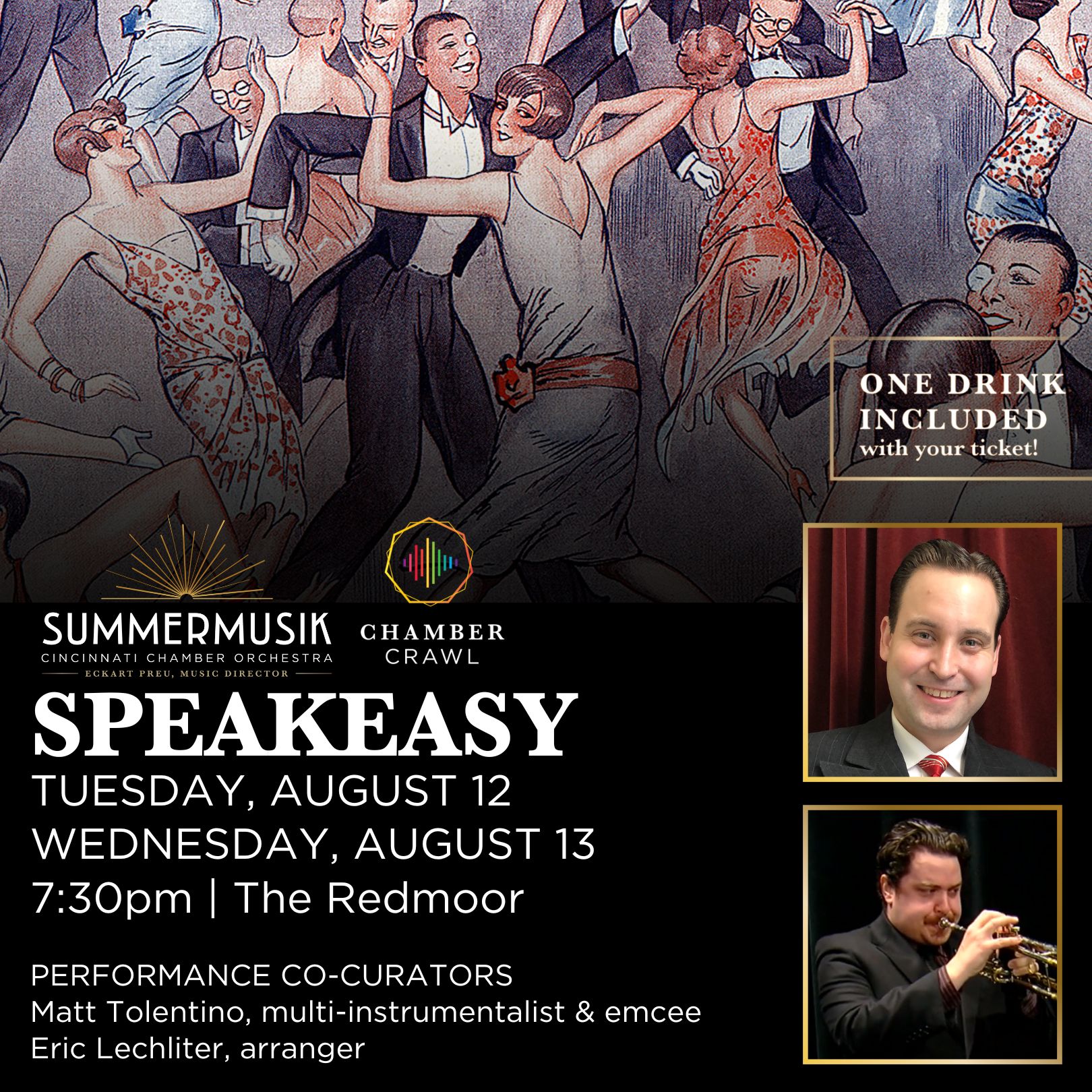 Wear your best flapper outfit and celebrate 1920s style at our Chamber Crawl series: One drink included in the price of admission! Featuring multi-instrumentalist Matt Tolentino with a 1920s jazz ensemble.
